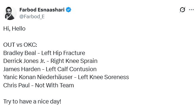 北京时间12月18日,快船官方更新明日对阵雷霆的伤病名单,哈登确定因左小腿挫伤缺阵。比尔、小德里克-琼斯、尼德豪泽、保罗也都在缺阵名单上。队记报道,哈登没有随队前往俄克拉荷马城,后续对阵湖人的比赛状态暂不确定,他也有可能缺席洛城德比。