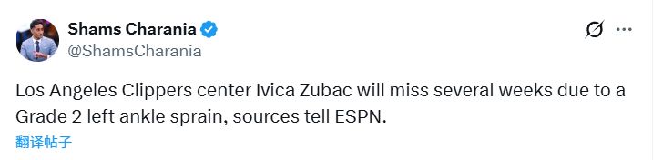 北京时间12月22日,据名记Shams报道,ESPN消息源透露,洛杉矶快船队中锋祖巴茨因左脚踝二级扭伤,将缺阵数周时间。TA的报道称至少要休战三周。